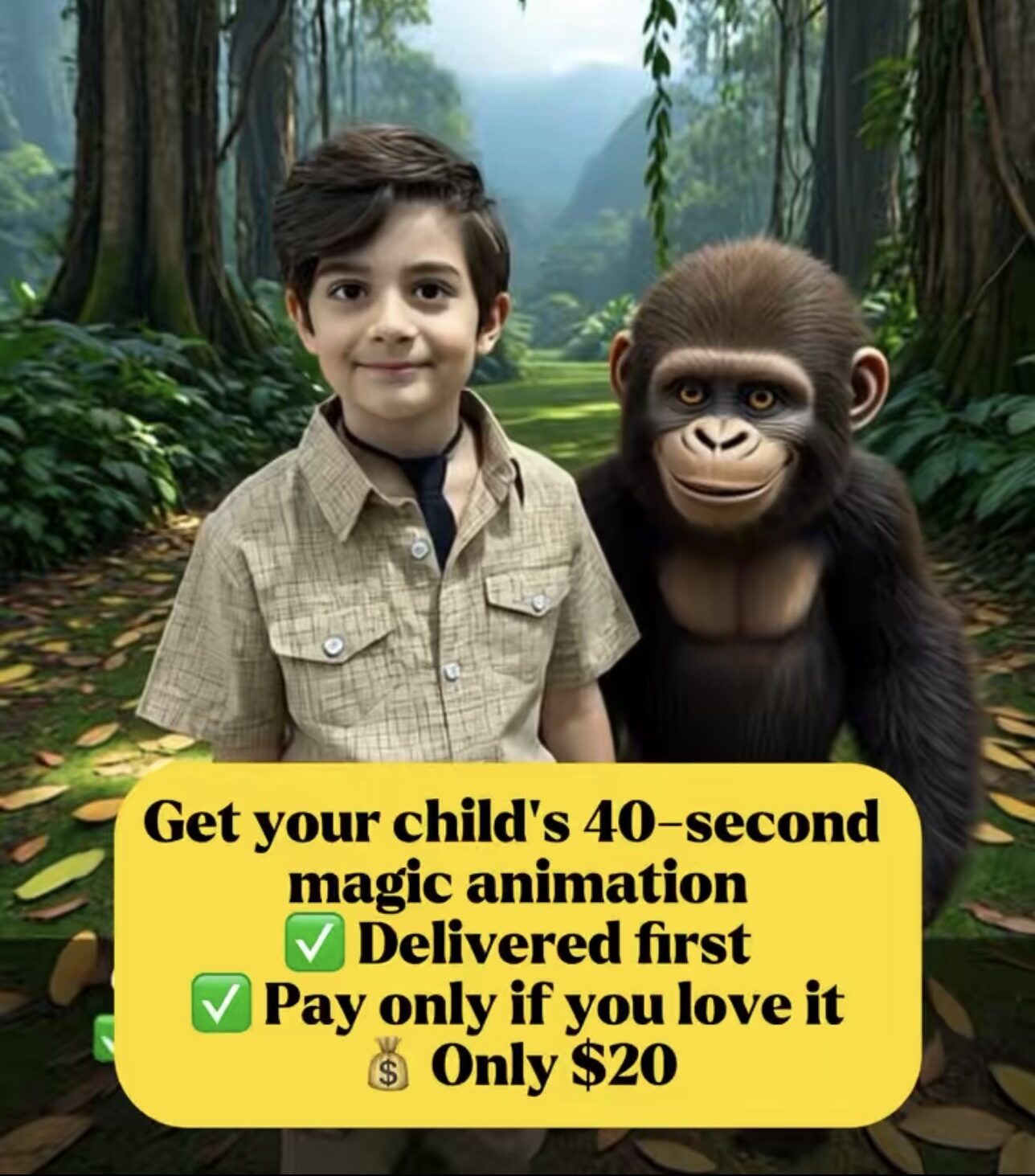 Unlike traditional cartoon-style kids animations, we create real photo kids animation using your child’s actual photo, placing them into a magical animated scene alongside animals or fantasy characters they love.